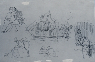 Name: Embarkation of the Pilgrims, Notebook Sketches Artist: Robert W Weir a/k/a: Year: ~1840 Format: Size: Signed? Location: Website ID: EMBS9 Estate #: Provenance: Condition: Auction Price: Auction Estimate: Auction Year: Exhibited? NAD? Tuckerman? Irene Weir Book? William Gerts? Ahrens Plate/Page? References: Notes: From a plate negative (from PR26). Has written on it 'Note book sketches of Embarkation' URL: Score: 0/10 Images:![]()