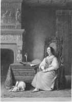 Notes: Girl in medieval costume asleep in high-backed chair by table on which rests a lute. Dog asleep at her feet. Ornamental fireplace in background left.