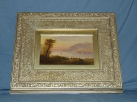 Name: Hudson River school painting with pink and yellow pastel hues Artist: Robert W Weir a/k/a: Year: 1872 Format: Oil on board Size: 11x6.75 Signed? Attributed. Signed RWW. Location: Website ID: PAST1 Estate #: Provenance: Condition: Auction Price: $2,280 Auction Estimate: $3,000 Auction Year: 2016 Exhibited? NAD? Tuckerman? Irene Weir Book? William Gerts? Ahrens Plate/Page? References: Notes: URL: Score: 1/10 Images:![]()